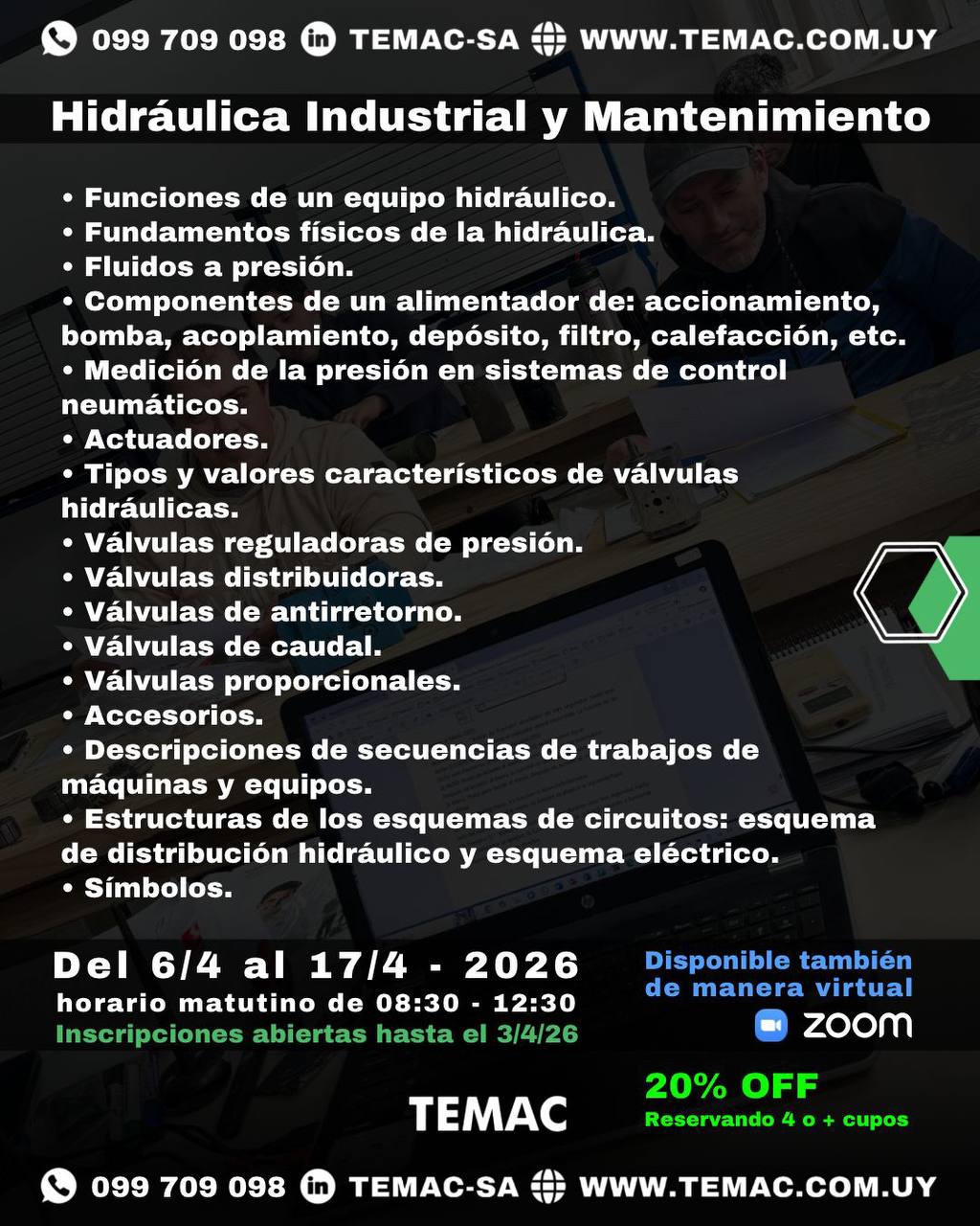 Información detallada sobre el curso teórico-práctico de Hidráulica Industrial y Mantenimiento ofrecido por TEMAC S.A. en marzo de 2026, abarcando desde fundamentos físicos hasta esquemas de distribución y válvulas proporcionales.
